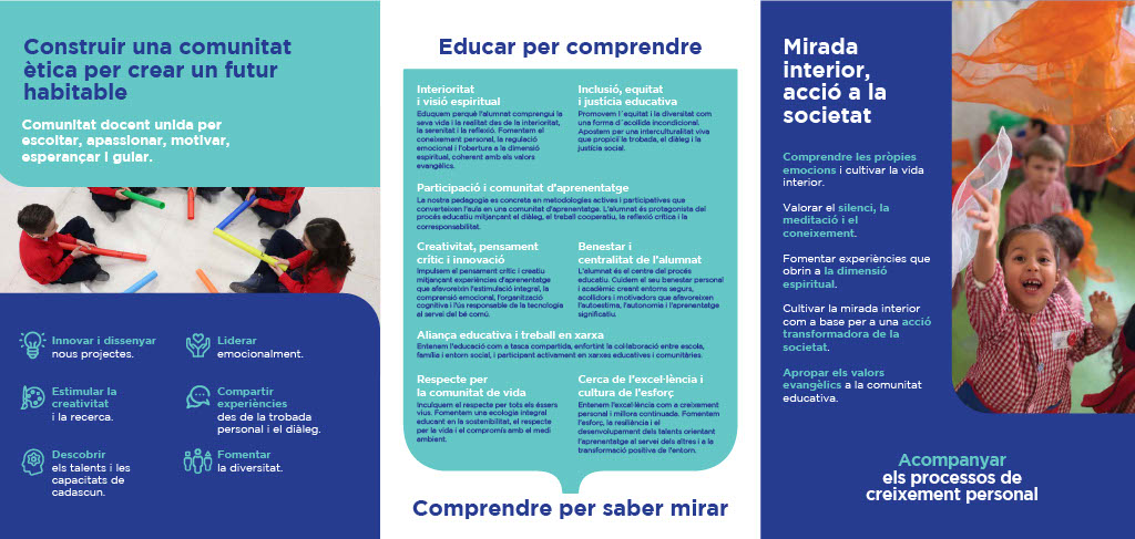 Els col·legis gabrielistes volem assegurar el creixement i maduració dels alumnes en totes les seves dimensions. Pretenem que assoleixin les competències bàsiques i desenvolupin al màxim les pròpies capacitats amb una actitud d’aprenetatge constant. Promovem la seva inserció en el món de forma crítica, responsable i constructiva fomentant, en els nostres alumnes, el descobriment de valors i la formació d’actituds que de forma lliure i responsable integrin a la seva vida.