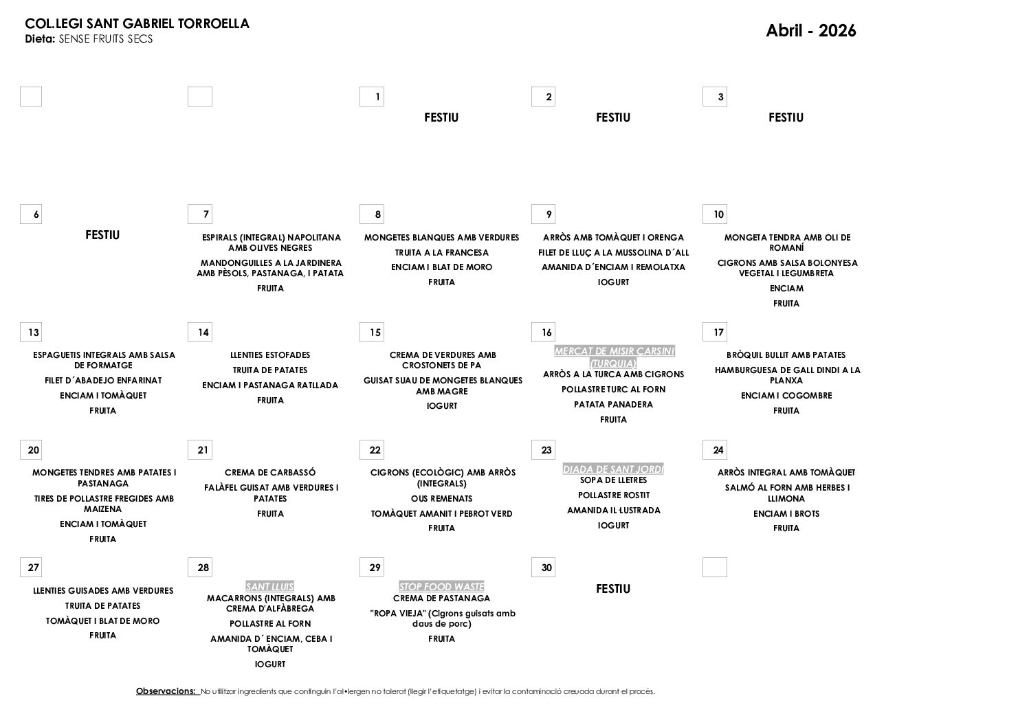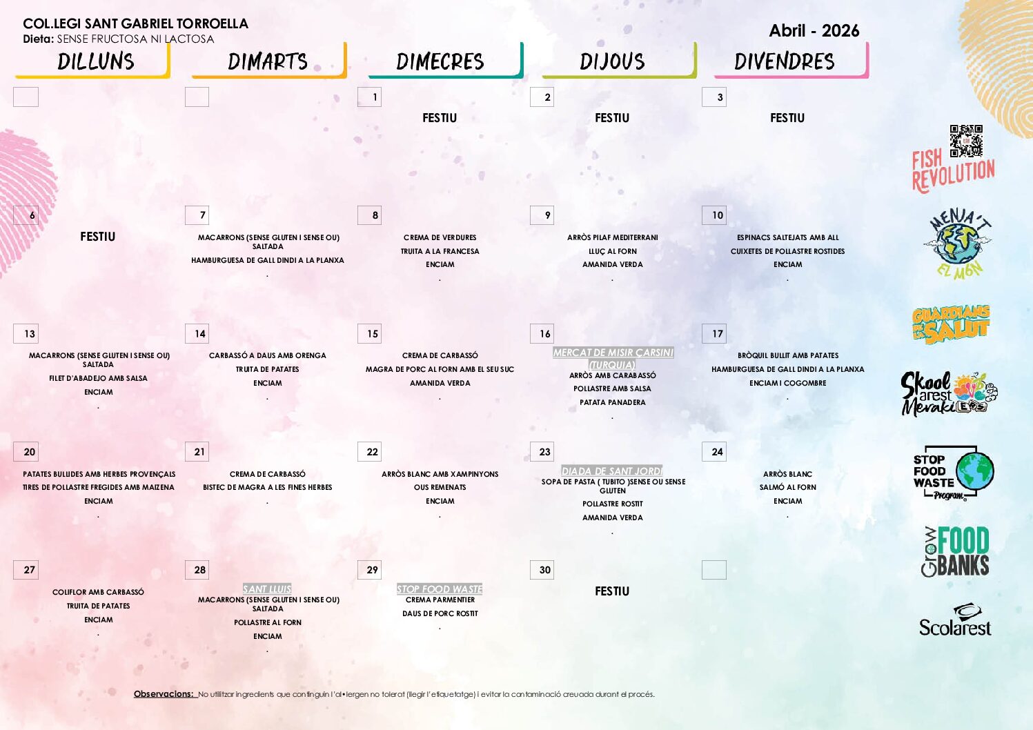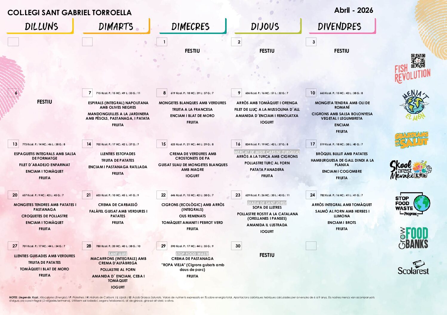 El menú canvia de forma mensual; es pot consultar a continuació amb les variacions: