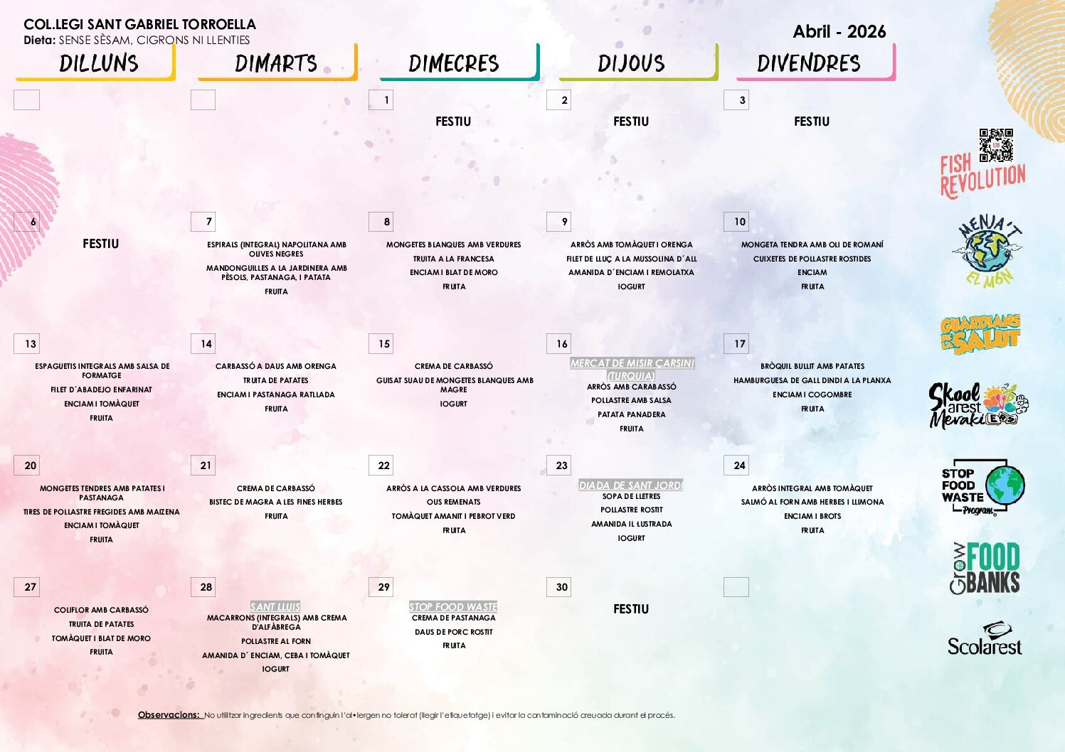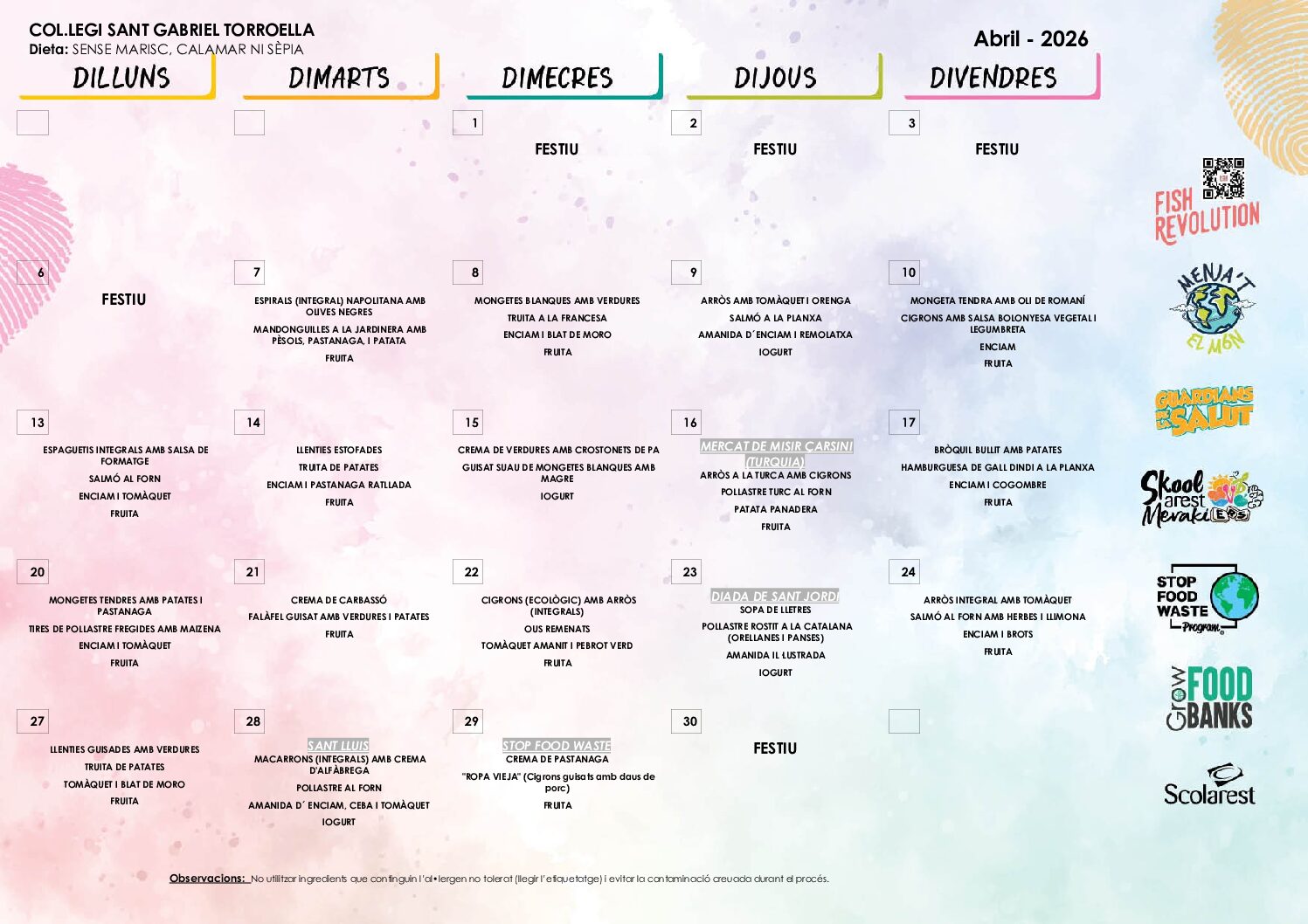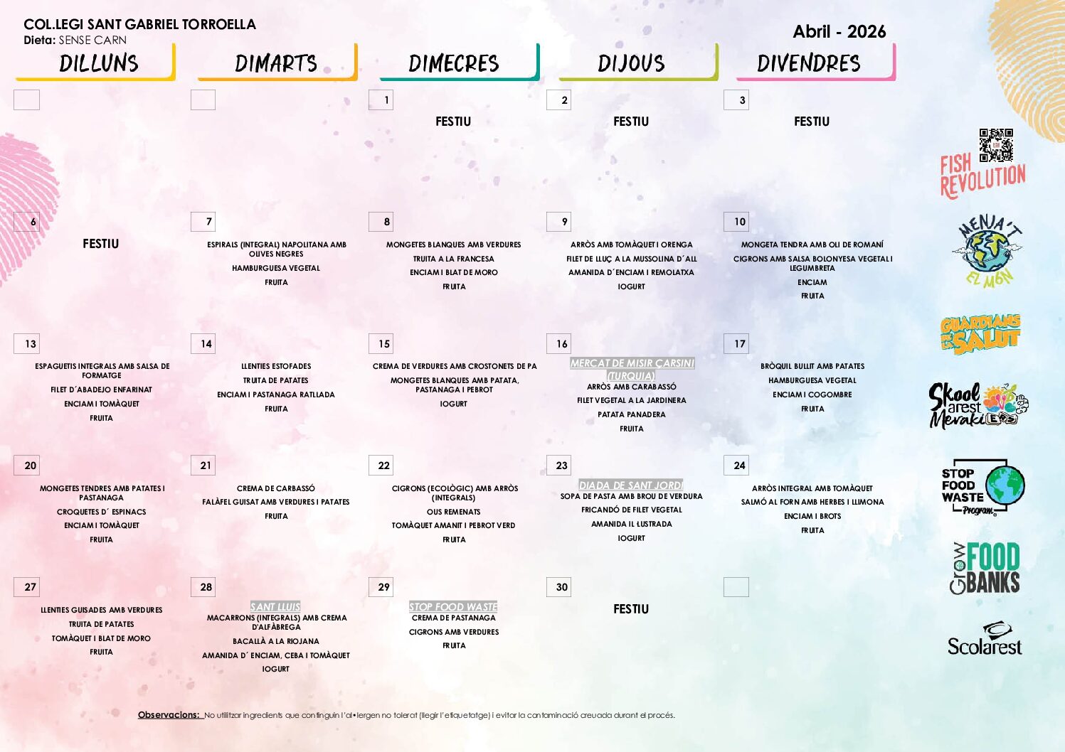El menú canvia de forma mensual; es pot consultar a continuació amb les variacions: